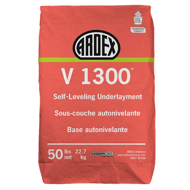 ARDEX V 1300™ Self-Leveling Underlayment is a high-performance, pourable or pumpable underlayment designed to level and smooth interior substrates before installing finished flooring. It delivers exceptional flow, strength, and versatility with a variable water ratio for optimal coverage and handling. Suitable for use over concrete, wood, terrazzo, and properly prepared non-porous surfaces, it creates a smooth, durable base for a wide range of floor coverings in dry, interior environments.